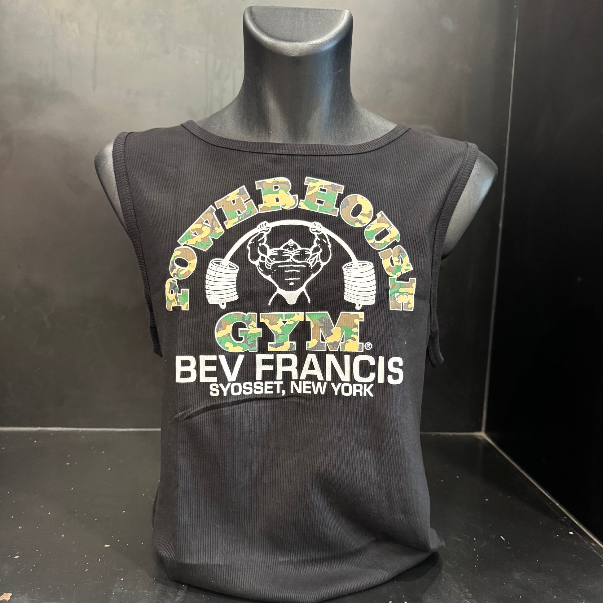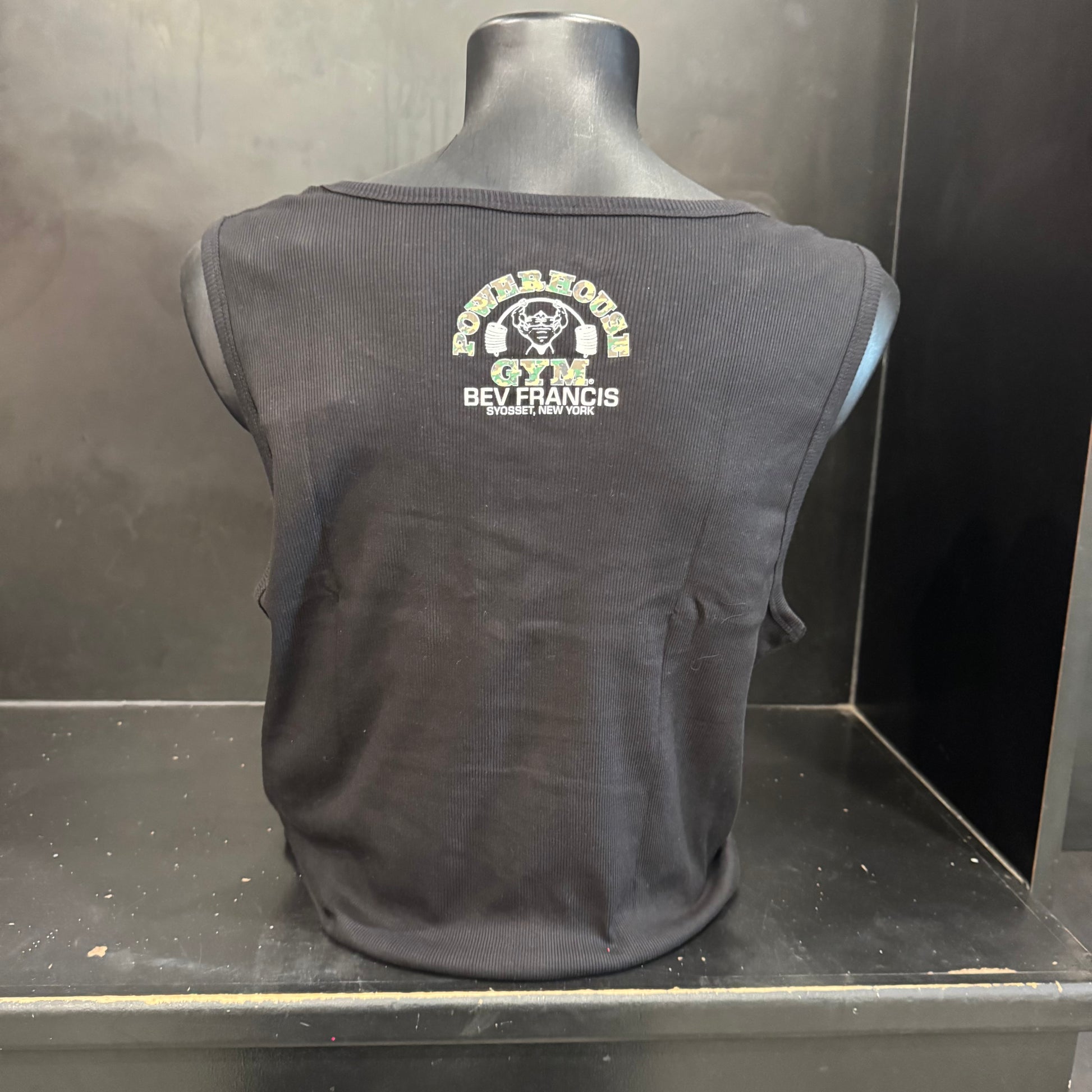 Bev Francis Powerhouse Gym men's ribbed tank, featuring the Powerhouse logo on the front and a smaller logo on the upper back.